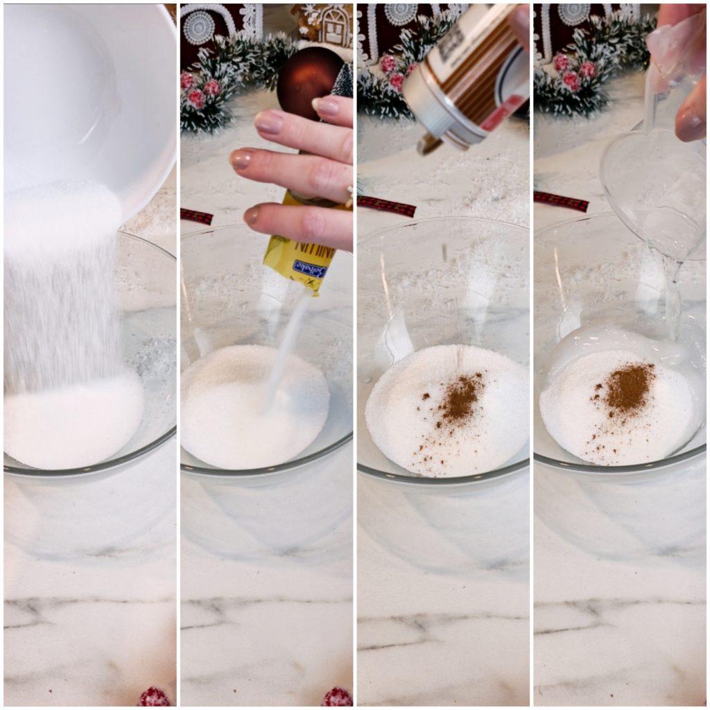 Zucker, Vanillezucker, Zimt und Wasser in einer Schüssel mischen
