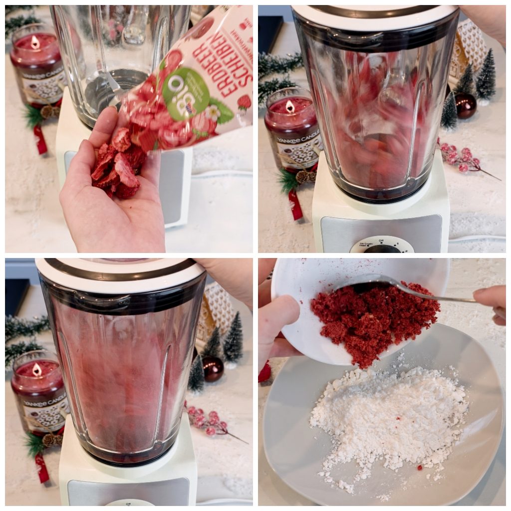 Eine Handvoll gefriergetrocknete Erdbeeren im Mixer pulverisieren, danach mit ca. 7 Esslöffeln Puderzucker vermischen