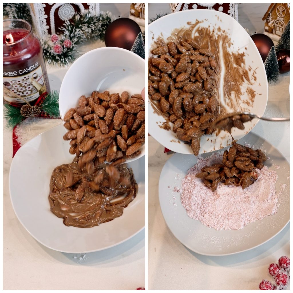 Mandeln darin wenden, bis sie gleichmäßig überzogen sind. Anschließend sofort im Erdbeerpuderzucker wenden, solange die Schokolade noch geschmolzen ist.