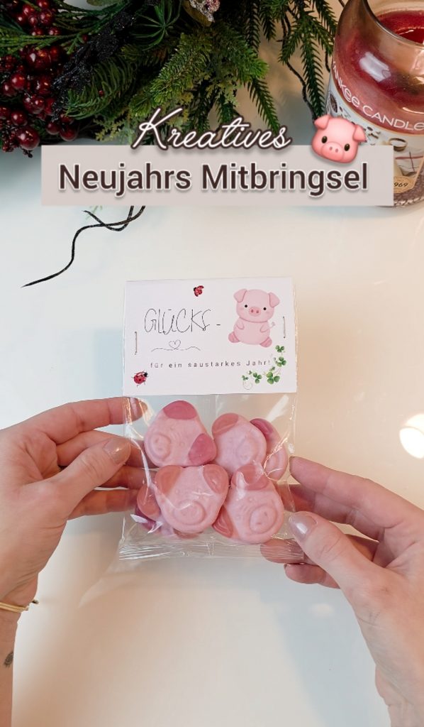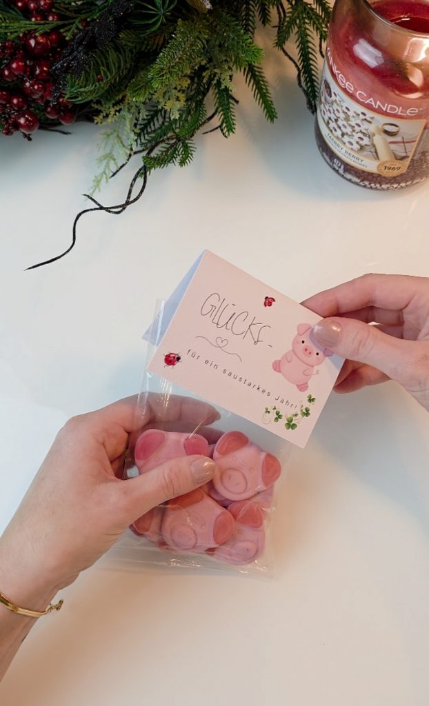 Ein kleines, süßes Geschenk für Silvester muss nicht kompliziert sein – mit meiner PDF-Vorlage für das Etikett kannst du im Handumdrehen ein Tütchen mit Katjes Fred Ferkeln als besonderen Neujahrsgruß zaubern. Die Tüte hat die Größe 10 x 15 cm und bekommt oben ein liebevolles Etikett mit süßen Neujahrswünschen – perfekt, um Freunden, Familie oder Kollegen ein Lächeln ins Gesicht zu zaubern. Damit hast du die perfekten „Glücksschweinchen“ zum verschenken.