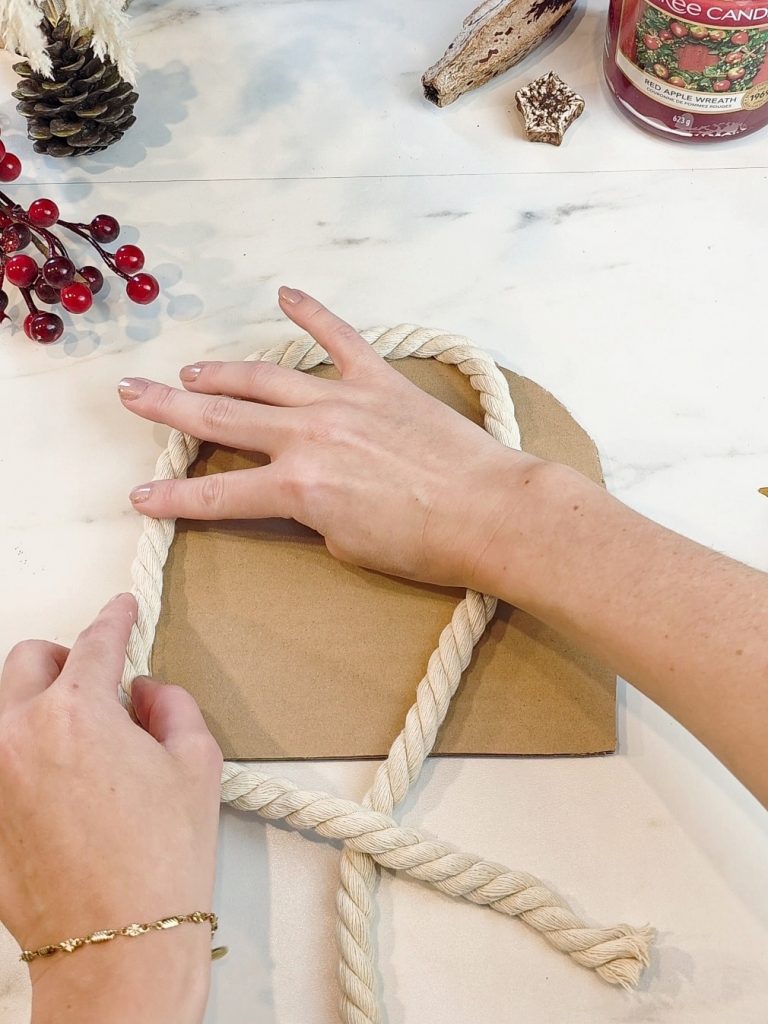Die vorbereiteten Seilstücke klebt man dann, wie abgebildet, jeweils halbrund auf die vorgeschnittene Pappe.