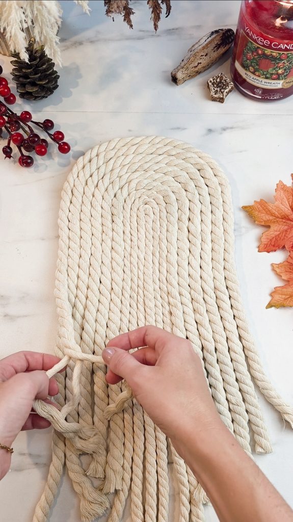 Die überschüssigen Seilenden, die nun von der Pappe herunterhängen, fädelt man auseinander, sodass sie ordentlich in Wellen fallen und den Geistkörper formen.