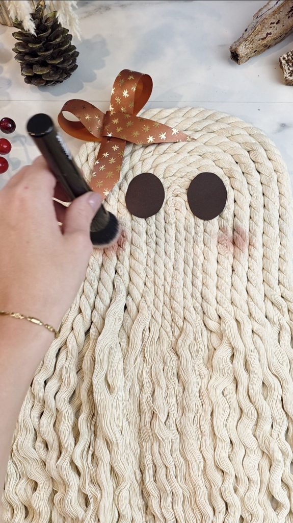 Die ausgeschnittenen Augen klebt man auf den Geist. Anschließend kann man eine Schleife oben anbringen und etwas Rouge auf die Wangen tupfen.