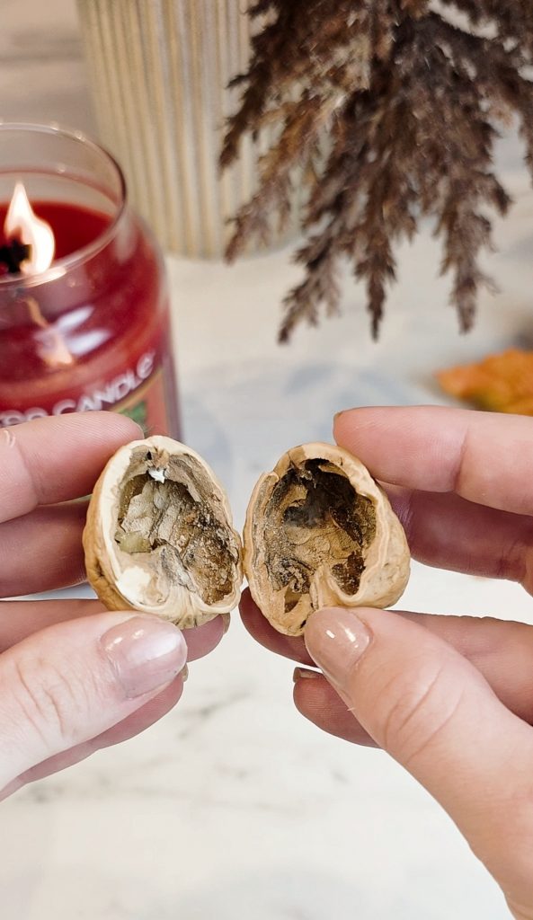 Zuerst knackst du die Walnuss vorsichtig in der Mitte auf. Um die Schale nicht zu beschädigen, empfiehlt es sich, am besten eine kleine Säge zu verwenden. So bleibt die Nusshälfte schön intakt und eignet sich perfekt als Mini-Körbchen. Entferne dann das Innenleben der Walnuss.