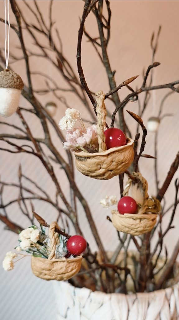 Tipp: Wenn du mehrere Körbchen bastelst, wirken sie besonders schön in einer Gruppe oder an unterschiedlich hohen Zweigen.
