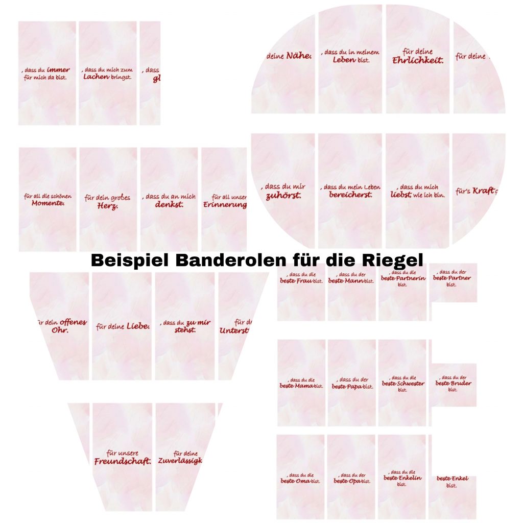 In meiner Datei ist eine riesige Auswahl an verschiedenen Banderolen mit verschiedenen Sprüchen enthalten, so ist sicher für jeden das Passende dabei, nicht nur für den Partner. Auch die Cover sind in mehrfacher Ausführung enthalten, sodass auch die Verpackung individuell für jeden Beschenkten gestaltbar ist. Für alle, die selber kreativ werden möchten, sind außerdem 24x leere Banderolen zum selber beschriften enthalten.