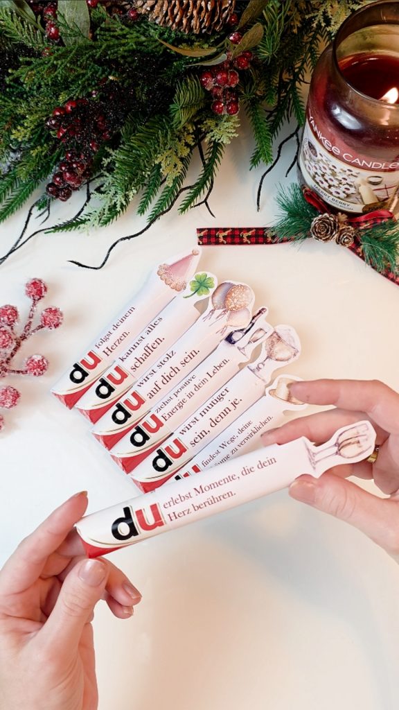 Mein kreatives Duplo-Geschenk ist für mich die perfekte DIY-Idee für Silvester und Neujahr, um Freunden, Familie oder Kollegen Glück und Freude ins neue Jahr zu senden. Mit meiner PDF-Vorlage kannst du die Duplos individuell gestalten: Jede Duplo-Riegel wird mit einer eigenen Banderole versehen, auf der eine ganz besondere Neujahrsprophezeiung für die / den Beschenkten steht. Im Hintergrund der Geschenkverpackung steht ein großes, goldenes Kleeblatt, das zusätzlich für Glück und positive Energie steht.