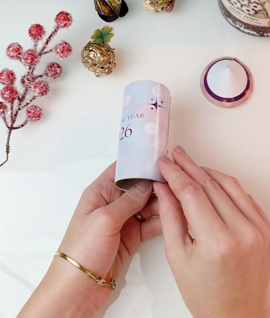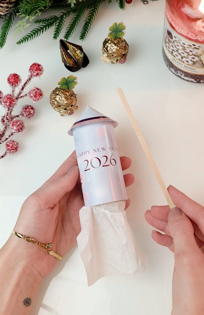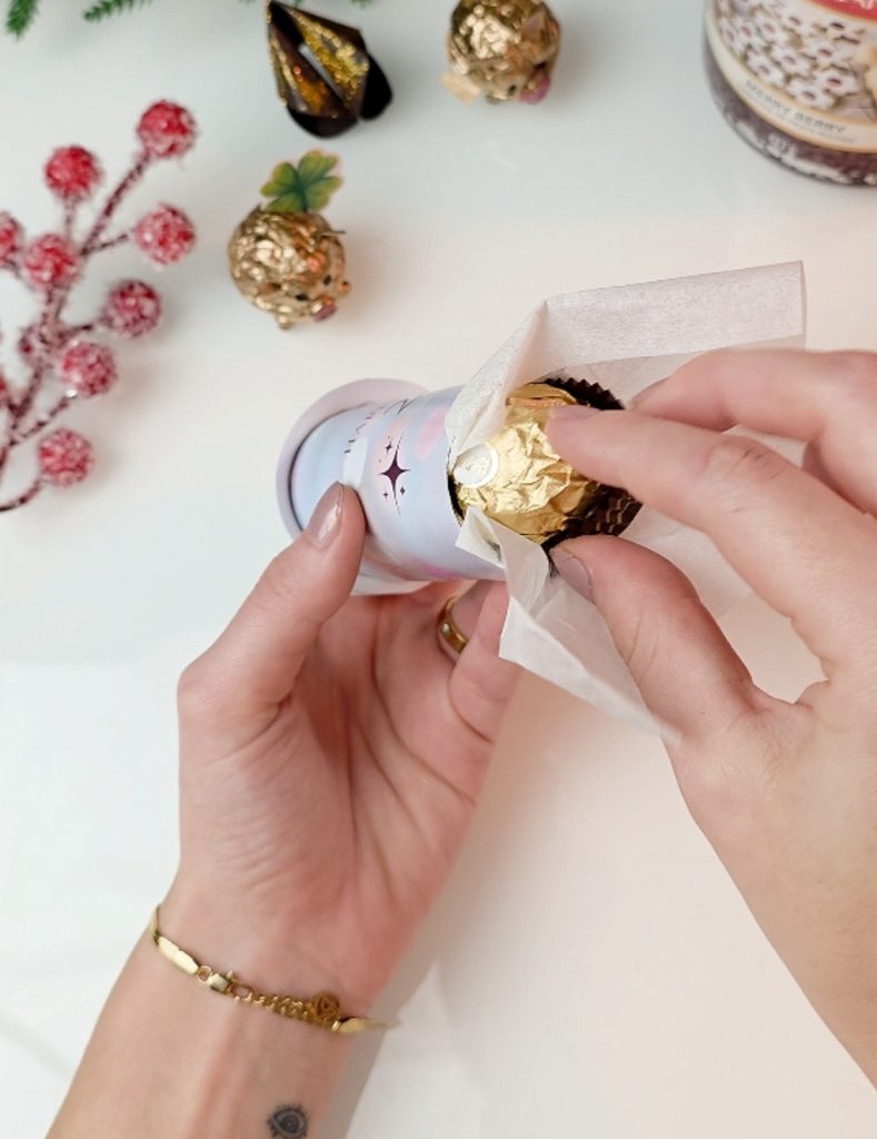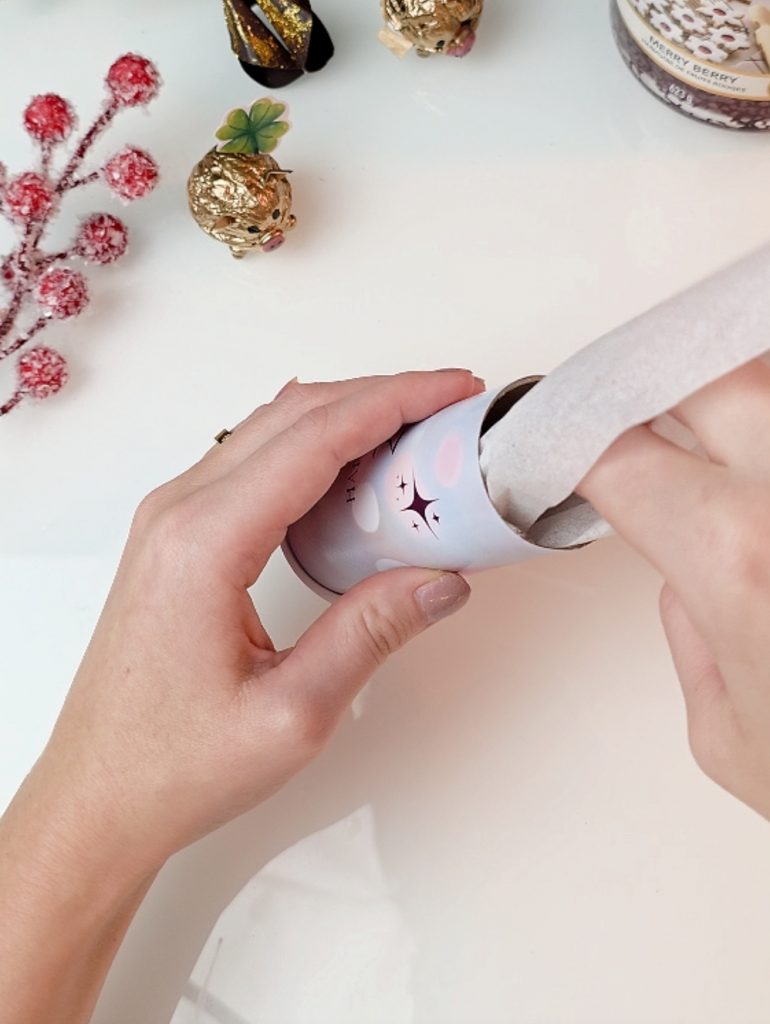 Fülle die Papierrolle vorsichtig mit deinen gewünschten Süßigkeiten oder kleinen Überraschungen.