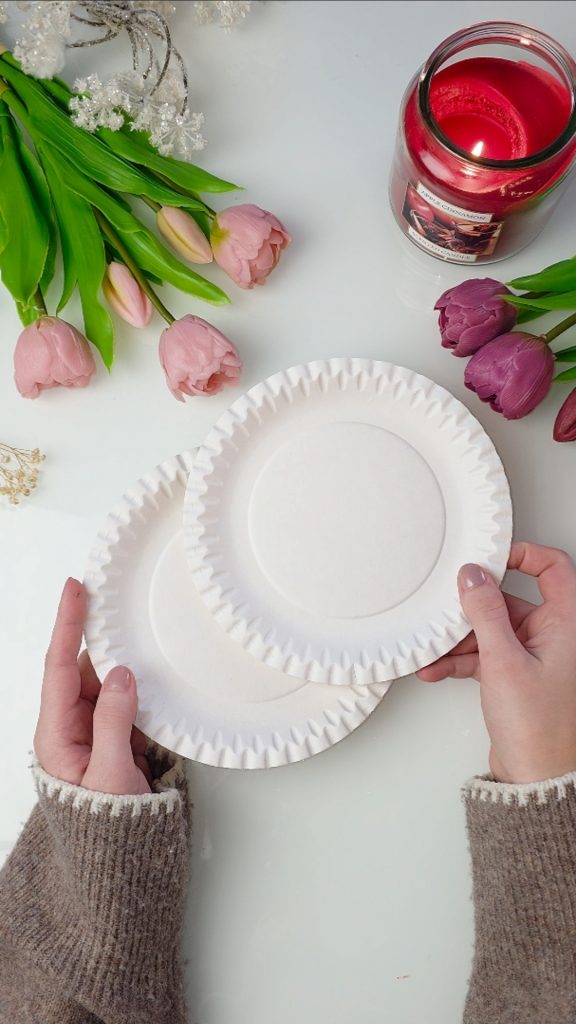 Nimm dir zwei Pappteller. Sie bilden später Vorder- und Rückseite deines Lämmchens.