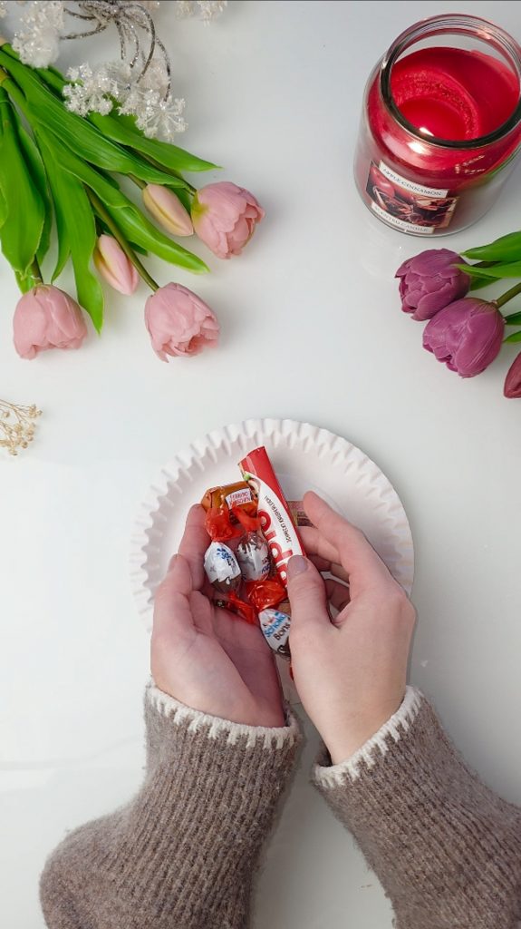 Lege die gewünschte Füllung – zum Beispiel Süßigkeiten, Geld oder Gutscheine – auf einen Pappteller.