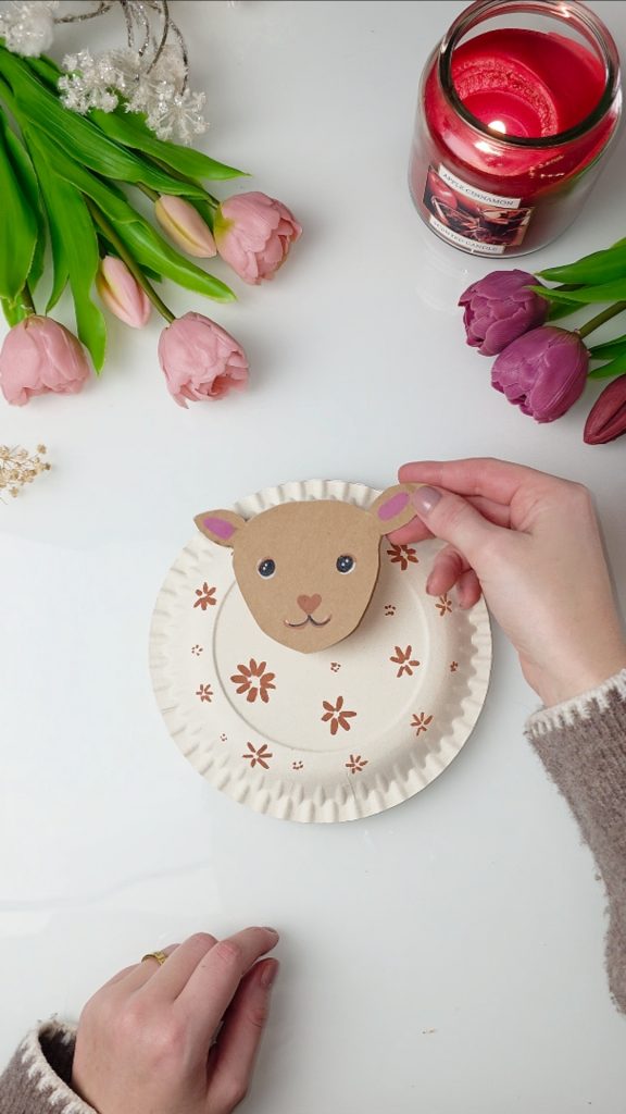 Schneide aus Pappe einen süßen Lämmchenkopf aus, bemale ihn und klebe ihn oben auf die Pappteller