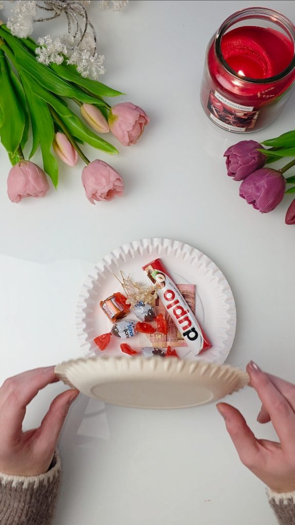Lege die gewünschte Füllung – zum Beispiel Süßigkeiten, Geld oder Gutscheine – auf einen Pappteller.