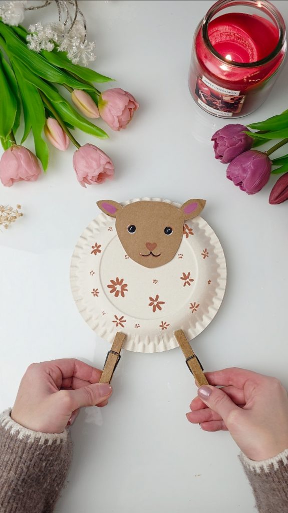 Schneide aus Pappe einen süßen Lämmchenkopf aus, bemale ihn und klebe ihn oben auf die Pappteller.