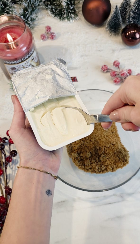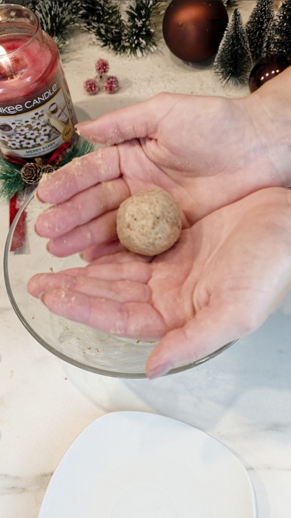 Zerkleinere die Spekulatius fein und mische sie mit Frischkäse, bis eine gut formbare, klebrige Masse entsteht. Die Masse sollte so fest sein, dass sie sich problemlos zu einer Kugel formen lässt und gut zusammenhält.