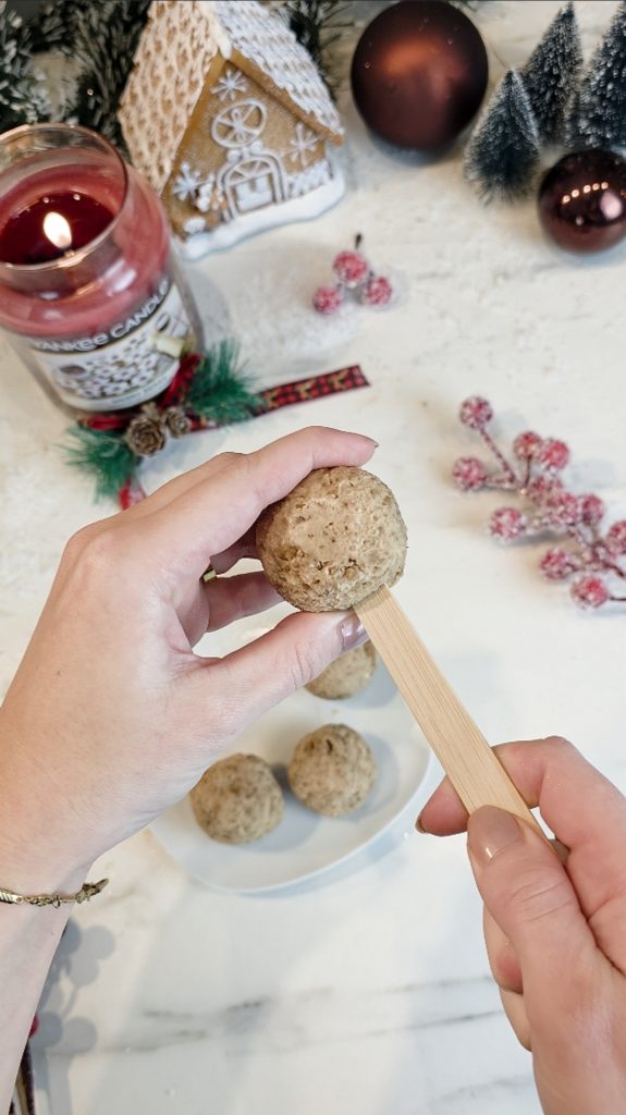 Stecke anschließend ein Eisstielchen vorsichtig in die Kugel und drücke es leicht fest. Lege die Kugel vorher kurz in den Kühlschrank, damit sie stabil wird.