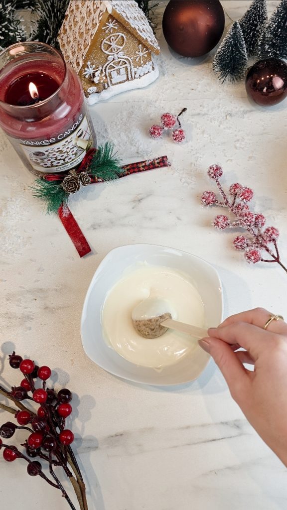 Nimm die gekühlte Kugel aus dem Kühlschrank und wälze sie vollständig in geschmolzener weißer Schokolade, sodass sie rundum bedeckt ist.