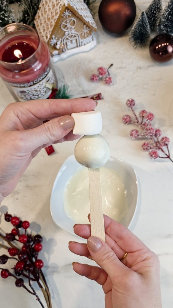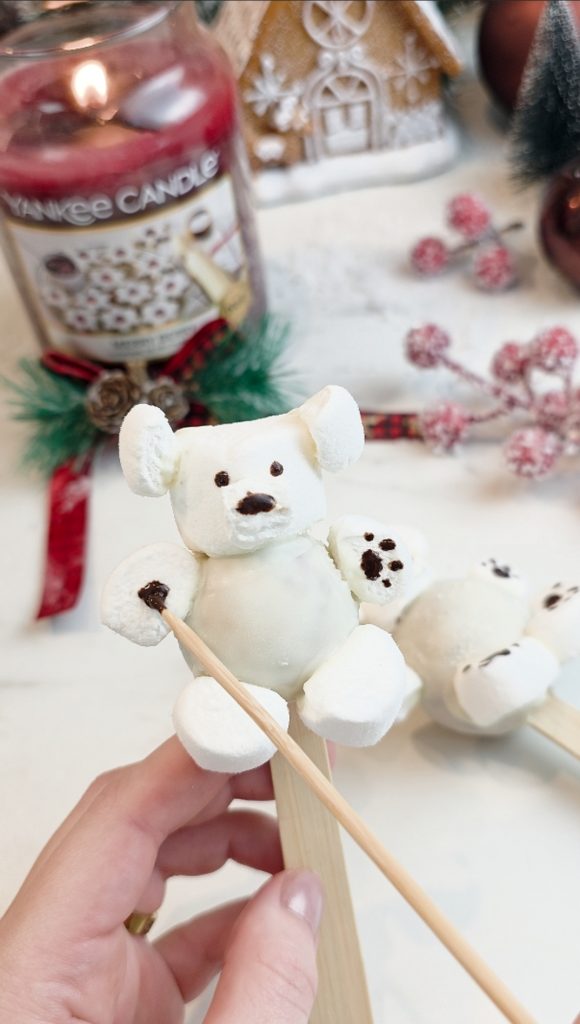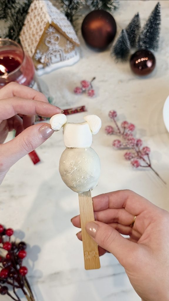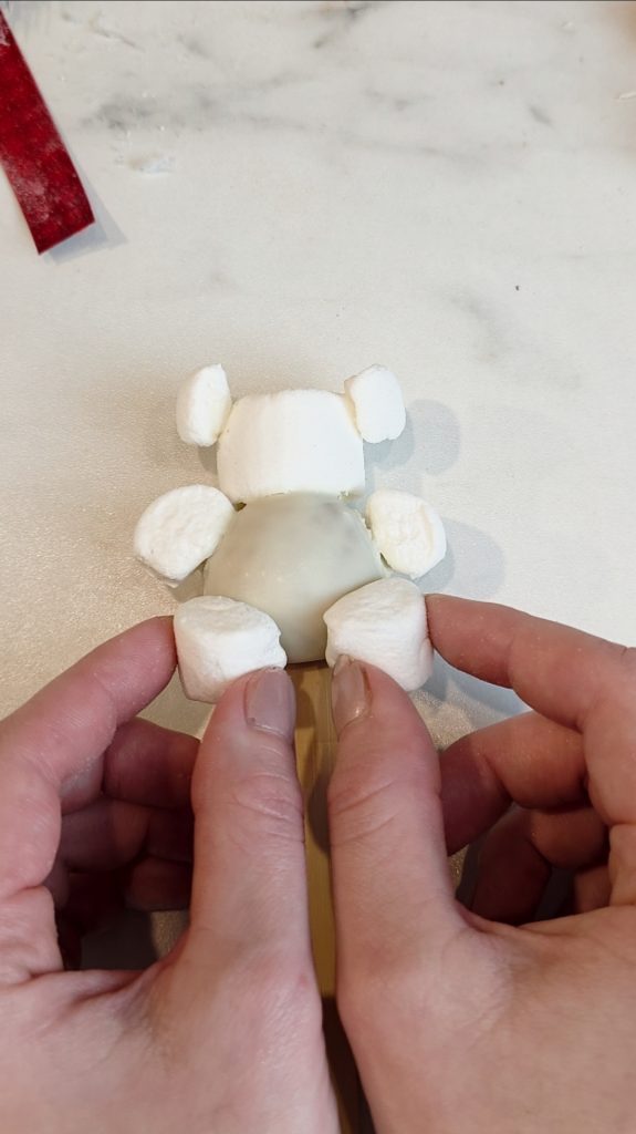 Setze nun einen Marshmallow als Kopf oben auf die Kugel und fixiere ihn mit etwas weißer Schokolade. Anschließend bringst du die Ohren, Arme und Füße ebenfalls mit geschmolzener weißer Schokolade an