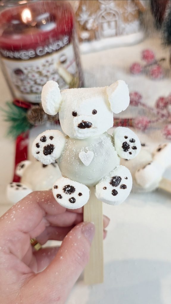 Besonders praktisch ist, dass sich die Spekulatius-Pralinen-Masse sehr gut formen lässt und durch die Kombination mit Frischkäse eine angenehm saftige Konsistenz bekommt. Die Marshmallows verleihen dem Polarbären seine typische Form – mit Kopf, Ohren, Armen und Füßen – während die weiße Schokolade für einen cleanen, winterlichen Look sorgt. Abgerundet wird das Ganze mit feinen Details aus brauner Schokolade und einer leichten Puderzucker-Schicht, die dem Polarbären einen frostigen Schnee-Effekt verleiht.