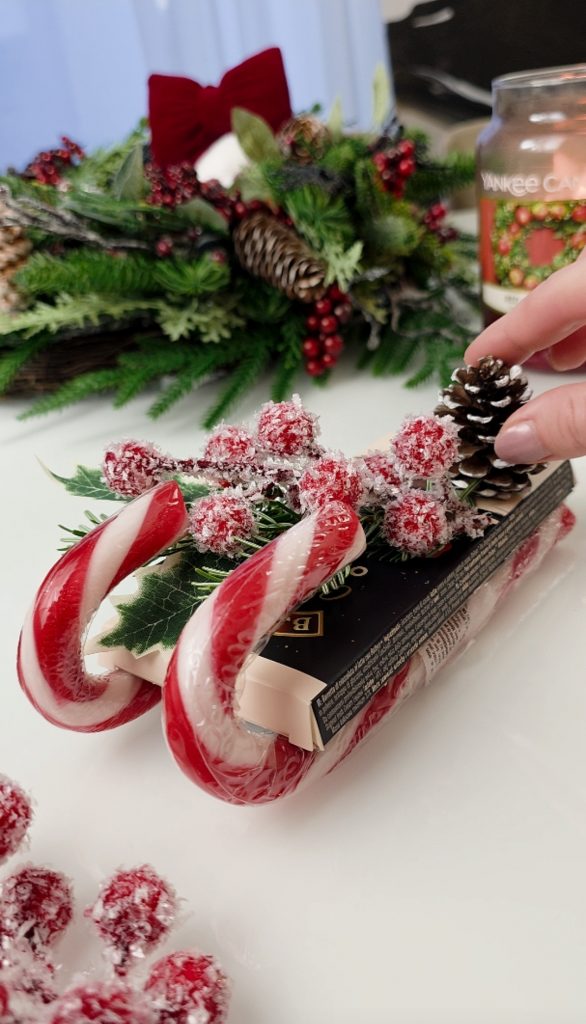 Dekoriere den Schlitten nach deinem Belieben. Ich habe mich für Beeren, Tanne und Tannenzapfen entschieden.